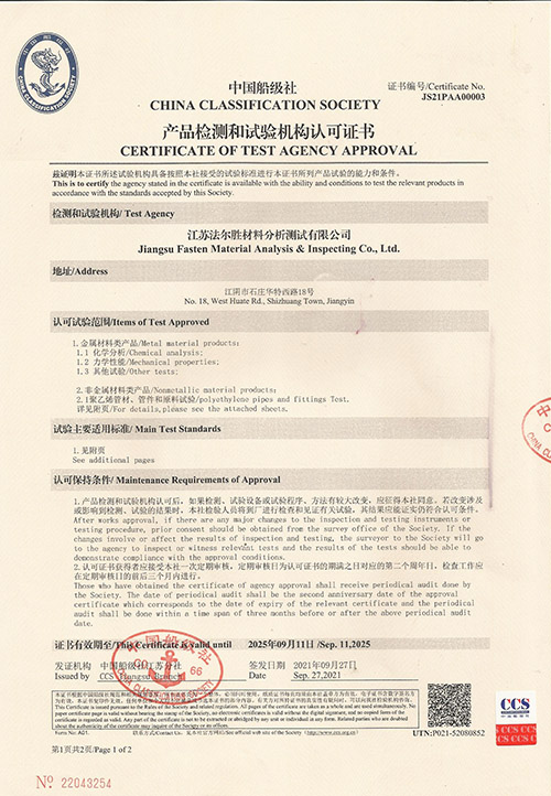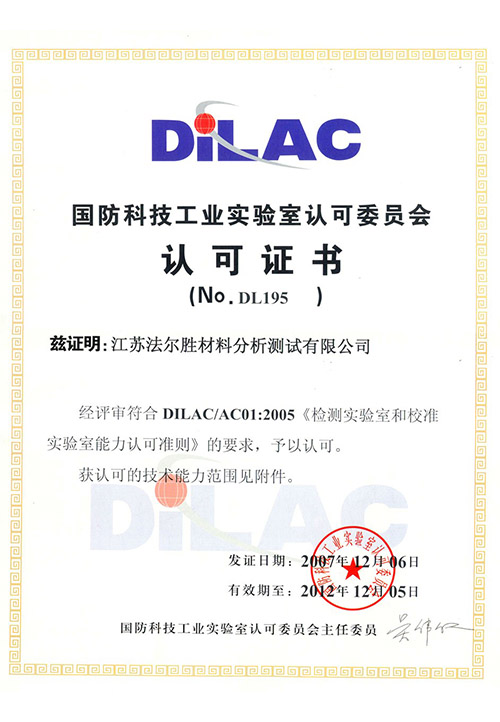 市场监督管理局检验检测机构资质认定(CMA)资质、国家实验室认可(CNAS)资质、中国船级社实验室认可(CCS)资质、国防科技工业实验室认可(DILAC)、特种设备无损检测机构核准资质和建设工程质量检测机构资质。可以出具市场监督局认可的第三方检测报告、世界64个国家互认的CNAS检测报告及多国船级社认可的检测报告。