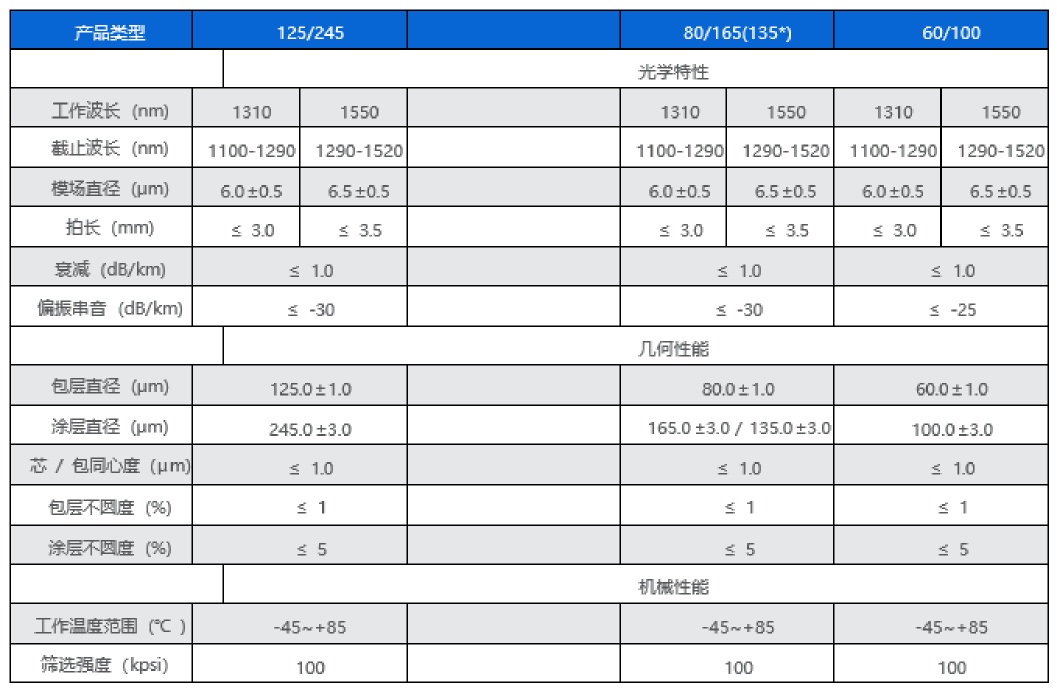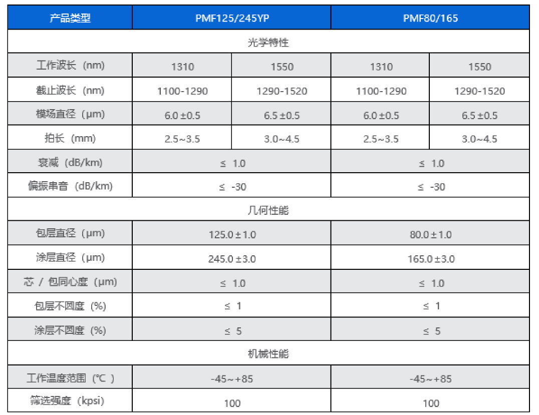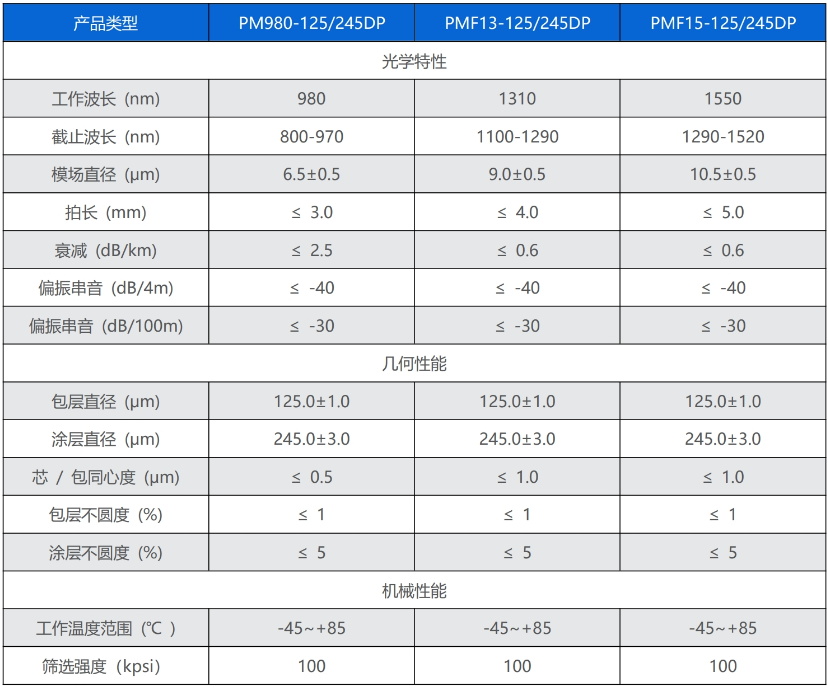 熊猫型保偏光纤采用 MCVD(改进的化学气相沉积)工艺制造 ,具有保偏性能优越、折射率分布精确、截面几何对称性好、纵向均匀性好、光学性能优异等特点。熊猫型保偏光纤采用紫外固化双涂覆层结构,光纤环境性能稳定。